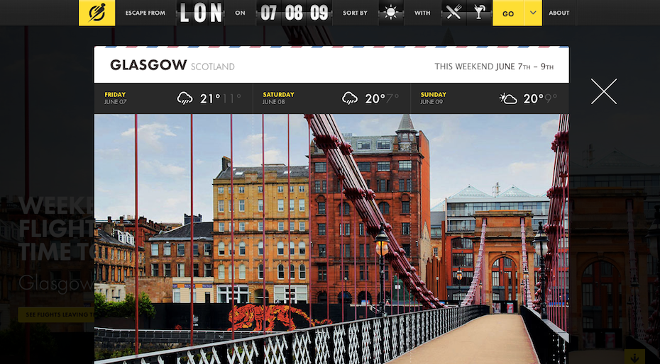 Escape Flight was a one-stop provider that focuses on making your weekend getaway easier than any other travel site. Specifically designed to target people in the big cities, who were looking for last-minute weekend getaways but were overwhelmed by analysis paralysis with hundreds of available flights.